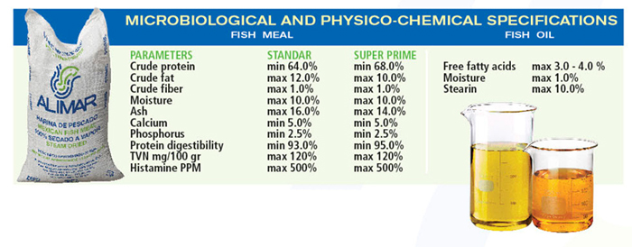 La principal materia que la compañia utiliza es sardina fresca de las especies criunda, monterrey y bocona, con las cuales se produce harina y aceite de pescado con la más alta y aceptable digestibilidad y proteínas cuyo contenido es elevado en aminoácidos esenciales y especialmente útiles para la industria de la acuacultura.